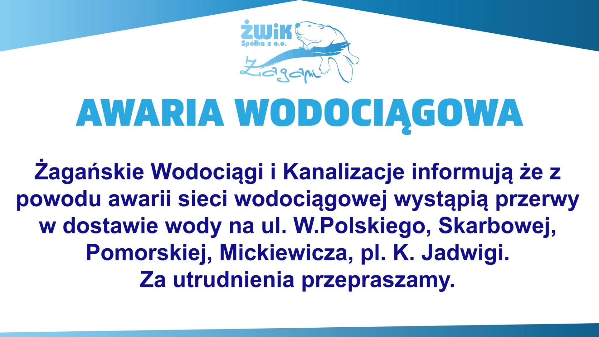 Żagańskie Wodociągi i Kanalizacje informują o awarii sieci wodociągowej, która spowoduje przerwy w dostawie wody na ulicach: W. Polskiego, Skarbowej, Pomorskiej, Mickiewicza oraz na pl. K. Jadwigi. Za wszelkie utrudnienia przepraszamy.