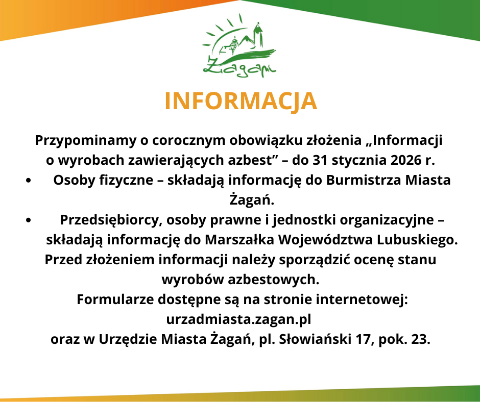 1. Osoby fizyczne niebędące przedsiębiorcami, wykorzystujące wyroby zawierające azbest przedkładają „Informację o wyrobach zawierających azbest” Burmistrzowi Miasta Żagań – do 31 stycznia 2026 r.
